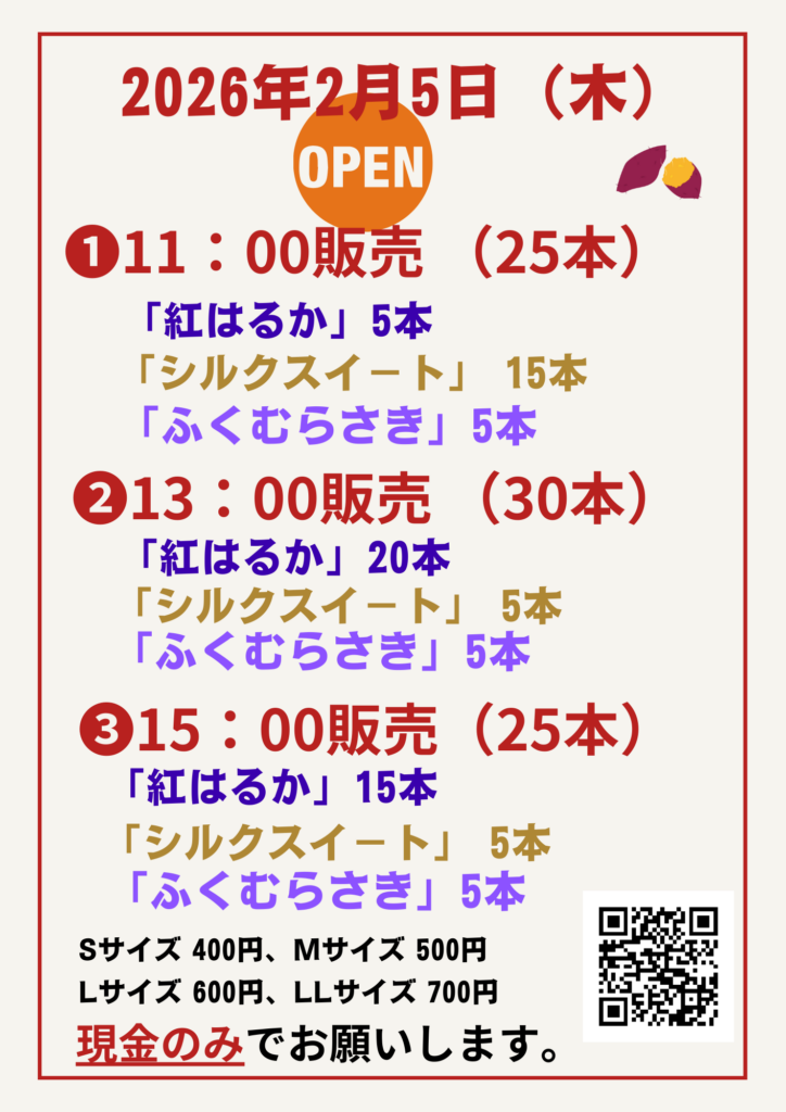 🍠 令和8年2月5日(木)販売『壺焼き芋』のご案内